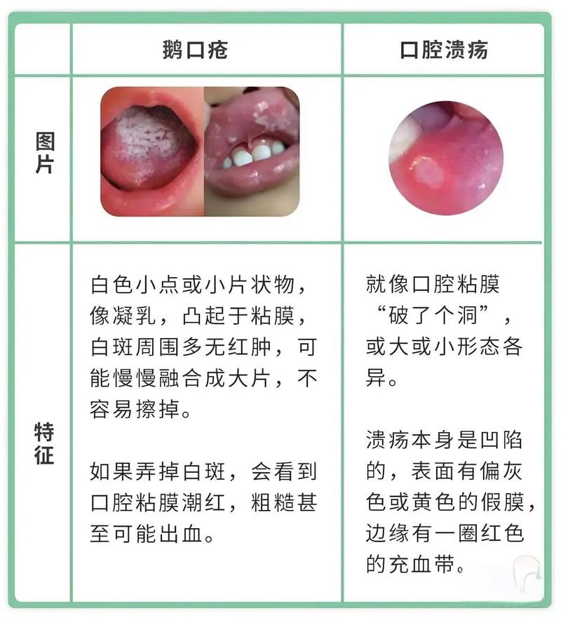 婴儿口腔溃疡和鹅口疮,到底咋区分? 为了方便您理解,我将通过一个清晰的对比表格和详细的文字说明来解释它们的区别。(图片来源网络,侵删) 核心区别速览表 特征 婴儿口腔溃疡 婴儿鹅口疮 本质 口腔黏膜的浅表性损伤或炎症,是“皮肤破了”。 由真菌(白色念珠菌)感染引起的,是“发霉了”。 病因 物理摩擦(咬伤、烫伤、硬物刮伤)营养不均衡(缺...