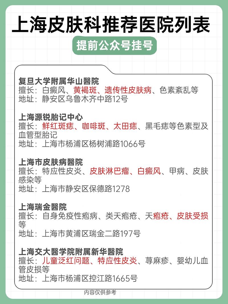 上海治疗皮肤科哪家好 顶尖综合医院皮肤科(实力最强,疑难杂症首选) 这类医院皮肤科是国家临床重点专科,拥有强大的专家团队、先进的设备和丰富的临床经验,是处理复杂、疑难皮肤病的首选。(图片来源网络,侵删) 复旦大学附属华山医院皮肤科 地位:全国皮肤科的“天花板”,公认的No.1,无论是科研实力、临床水平还是学术影响力都处于...