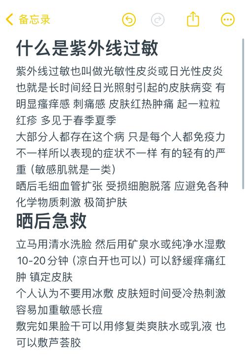 皮肤紫外线过敏怎么治? 治疗紫外线过敏需要一个综合性的方案,包括急性期治疗、长期预防和日常护理,下面为您详细拆解:(图片来源网络,侵删) 急性期发作时(已经出现红、痒、皮疹怎么办?) 当皮疹已经出现并伴有瘙痒时,首要目标是快速消炎、止痒、修复皮肤屏障。 冷敷: 这是最直接、最安全的方法,用干净的毛巾包裹冰袋或用凉水浸湿毛巾...