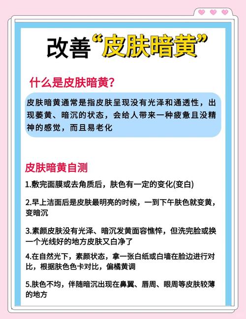 皮肤暗黄怎么调理能变白? 核心原理:皮肤为什么会暗黄? 在调理之前,我们先要明白原因,才能对症下药,皮肤暗黄主要由以下几个因素造成:(图片来源网络,侵删) 黑色素沉积:紫外线照射、炎症(如痘痘、过敏)会刺激黑色素细胞产生更多黑色素,导致肤色变深、暗沉。 角质层增厚:老废角质堆积,无法及时脱落,会让皮肤看起来粗糙、暗淡无光。 ...