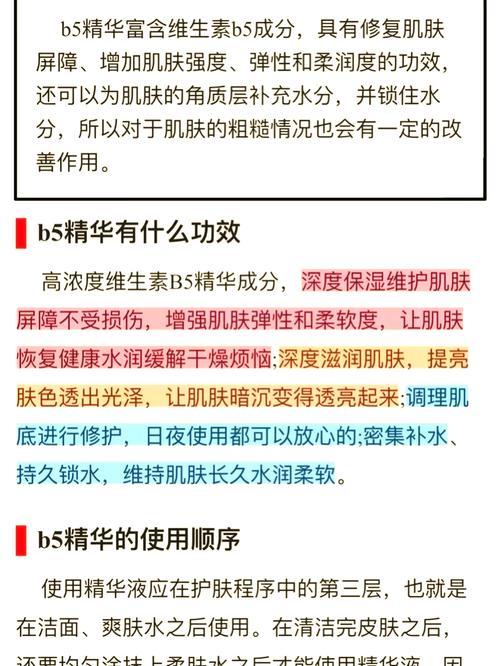 维生素B5如何呵护皮肤?功效与作用解析 维生素B5是皮肤和毛发健康所必需的关键营养素,它在护肤品领域通常以“泛醇”(Panthenol)的形式出现,因为它能高效地穿透皮肤,并转化为具有活性的形式——泛酸。(图片来源网络,侵删) 维生素B5被誉为“皮肤的保湿剂和修复剂”,其作用主要可以归纳为以下几个方面: 维生素B5对皮肤的核心作用 强效保...