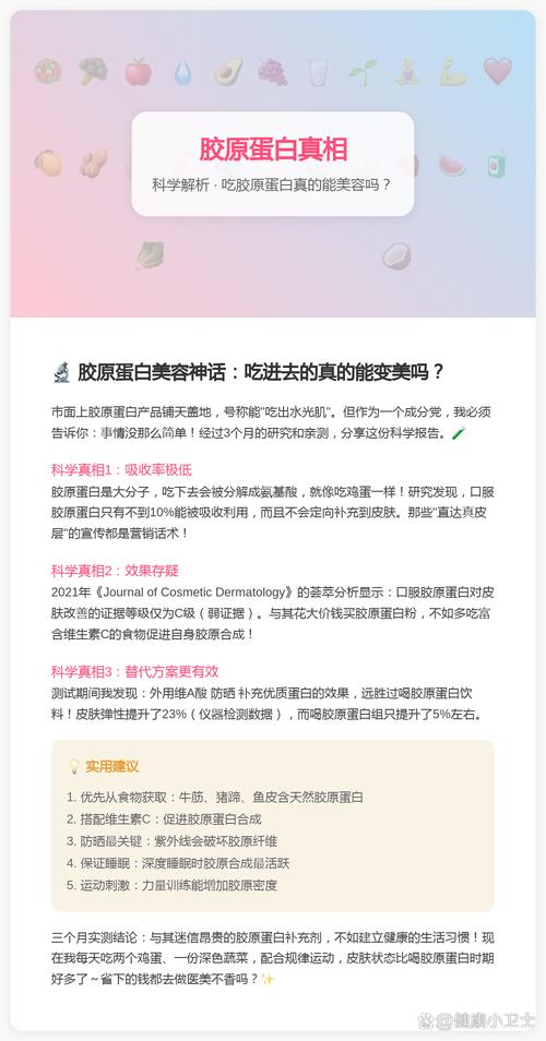 胶原蛋白真能被皮肤吸收吗? 这是一个非常常见且重要的问题,关于胶原蛋白是否能被皮肤吸收,简单的答案是:情况比较复杂,不能一概而论,取决于胶原蛋白的“形态”和“大小”。(图片来源网络,侵删) 下面我们来详细拆解这个问题: 皮肤的结构:一道天然的“屏障” 我们需要了解皮肤的结构,皮肤最外层是表皮,其最外层的部分叫做角质层,角质层细...