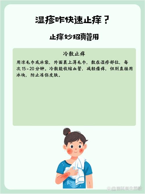 - 拍打:不要用指甲抓挠,而是用手掌轻轻拍打瘙痒处,可以分散瘙痒感。