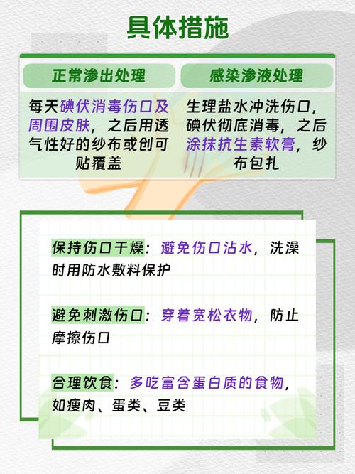 - 渗液情况: 初期少量淡黄色或血性渗液是正常的,如果渗液量突然增多,且变为黄绿色、脓性、有恶臭,可能是感染的迹象。