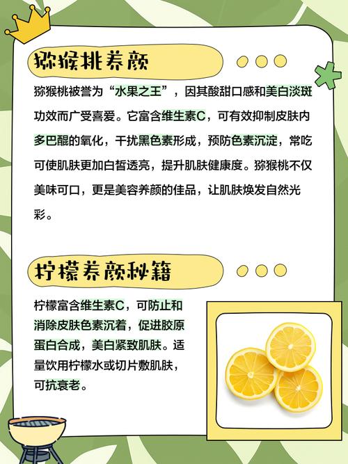 | 维生素C | 抑制黑色素生成、抗氧化、提亮 | 猕猴桃、草莓、橙子、彩椒、西兰花 |