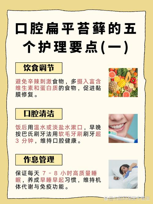 也是最重要的一点: 口腔扁平苔藓是一种慢性、免疫相关的疾病,容易反复发作,需要长期、规范的管理,请务必及时就医,遵从医嘱,不要轻信偏方或自行用药,保持良好的心态和健康的生活习惯(如规律作息、均衡饮食、减轻压力、戒烟限酒)对控制病情非常重要。
