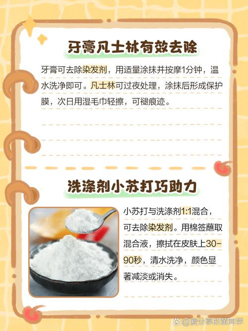 - 做法: 将少量小苏打与水混合,调成糊状,用棉签或手指蘸取,在染色处轻轻打圈按摩,然后冲洗干净,之后一定要涂抹保湿霜。