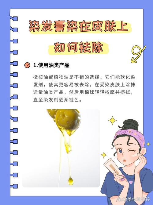 - 做法: 将足量的婴儿油或橄榄油涂抹在染色处,确保完全覆盖,用手指或化妆棉轻轻打圈按摩2-3分钟,让油充分渗透,静置5-10分钟后,用温水和肥皂清洗干净,可能需要重复1-2次。