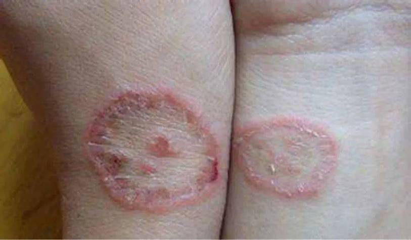 - 红斑边缘上可以看到小丘疹、水疱或鳞屑。