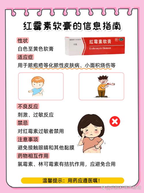- 红霉素外用也可能引起一些副作用,比如皮肤刺激、灼烧感、干燥、脱屑,甚至可能诱发过敏反应(虽然少见,但过敏的人使用后可能加重原有症状)。