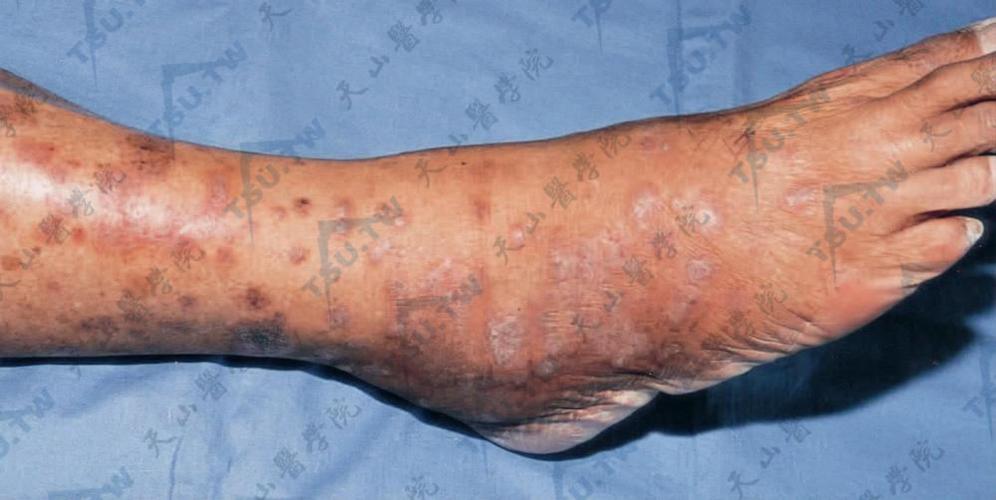 - 肥厚性扁平苔藓:常见于小腿和脚踝,皮疹非常肥厚、粗糙,呈疣状,颜色呈深褐色,瘙痒剧烈。