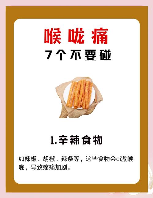 (图片来源网络,侵删)- 避免:薯片、坚果、油炸食品、硬饼干、油炸糕等,这些食物在吞咽时容易摩擦咽喉,划伤黏膜,加重疼痛。