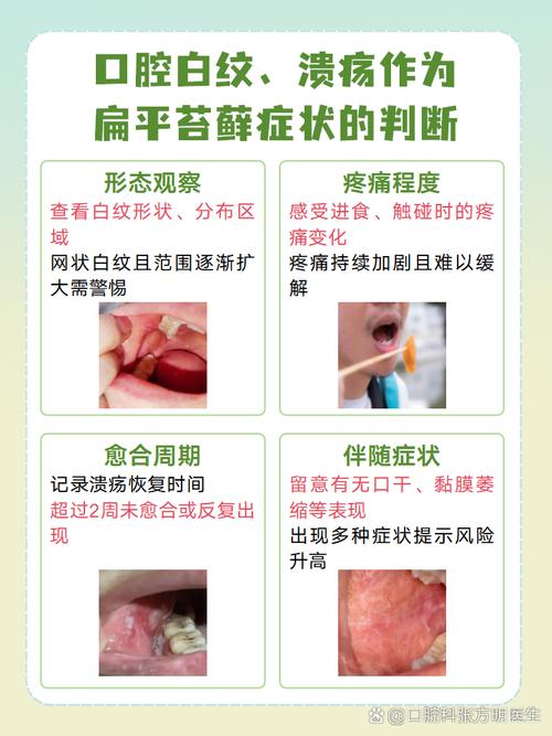 - 视觉上: 口腔黏膜上出现白色网纹、丘疹、斑块或糜烂。