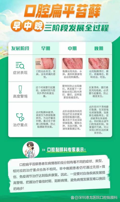 口腔扁平苔藓的治疗是一个长期、综合、个体化的过程,患者需要与医生充分沟通,建立信任,积极配合治疗,在日常生活中,保持良好心态、注意饮食、维护口腔卫生是控制病情、减少复发的关键,请务必在专业医生的指导下进行规范治疗,切勿自行用药。