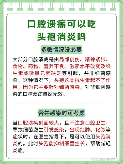 - 对于特定情况下(如创伤、感染、全身性疾病引起)的口腔溃疡,吃消炎药可能有用。