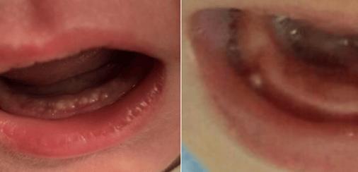 - 病因: 这是宝宝吃奶后残留在口腔黏膜上的奶汁,或者是一些上皮细胞堆积形成的“马牙”,属于正常现象,不需要治疗。