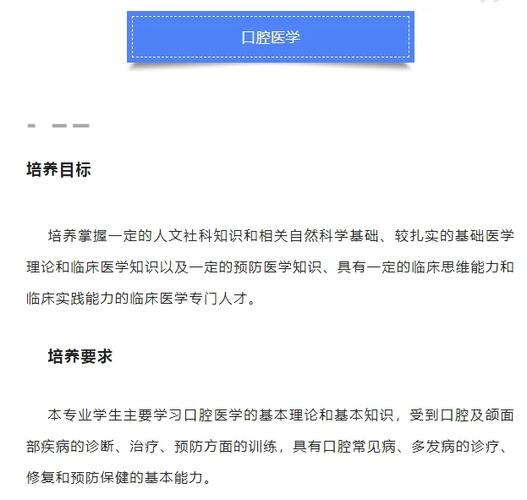 | 核心课程 | 基础医学类: 解剖学、生理学、生物化学、病理学、药理学等。 临床医学类: 内科学、外科学、诊断学等。 口腔核心类: 口腔解剖生理学、口腔组织病理学、牙体牙髓病学、牙周病学、口腔颌面外科学、口腔修复学、口腔正畸学、儿童口腔医学等。 |