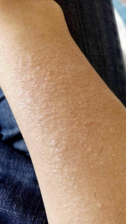 - 外观:皮肤上出现针头大小的、红色或肤色的小丘疹,摸起来粗糙有颗粒感。