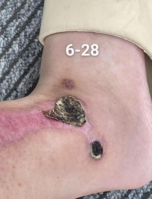 - 伤口表面被一层干燥、黑色的焦痂覆盖。