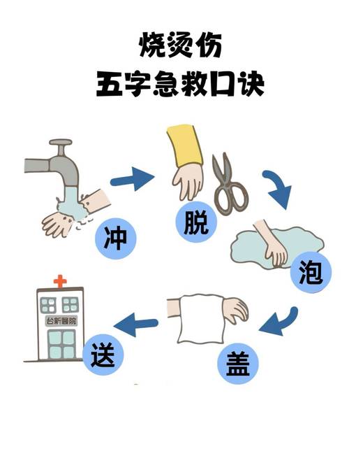 请遵循 “冲、脱、泡、盖、送” 的急救五步法,并根据烫伤的严重程度采取不同措施。