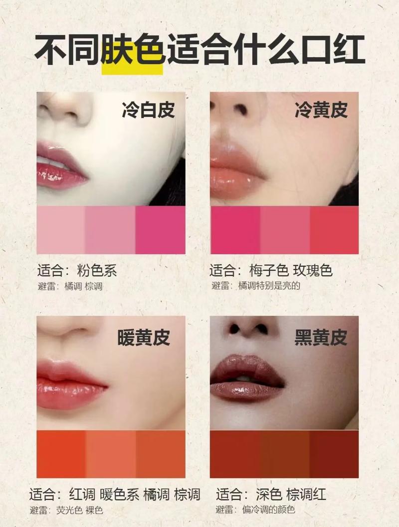 - 看个人冷暖调: 深肤色也分偏黄(暖调)和偏紫(冷调),暖调皮更适合橘、红、棕等暖色调;冷调皮可以尝试蓝调红、紫红色等冷色调。