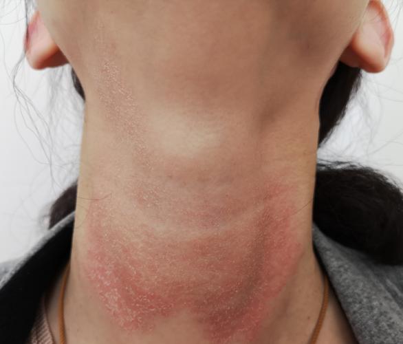 - 症状描述:颈部皮肤干燥、脱屑,伴有片状红斑,皮肤摸起来粗糙,在成人中,常见于脖子前方和两侧。