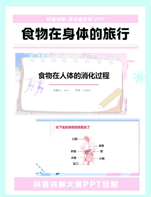 - 互动性: 在讲解过程中,可以提问听众,你们知道食物在胃里要待多久吗?”“你们猜猜小肠有多长?”