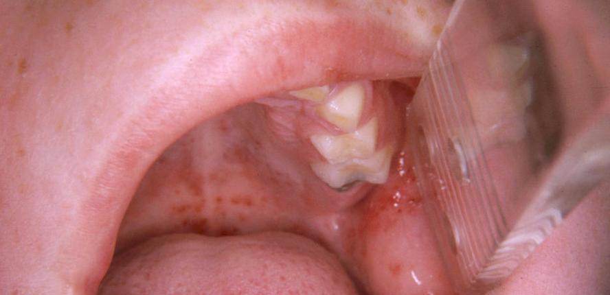- 红点或小白点位于上颚中线附近或牙龈上。