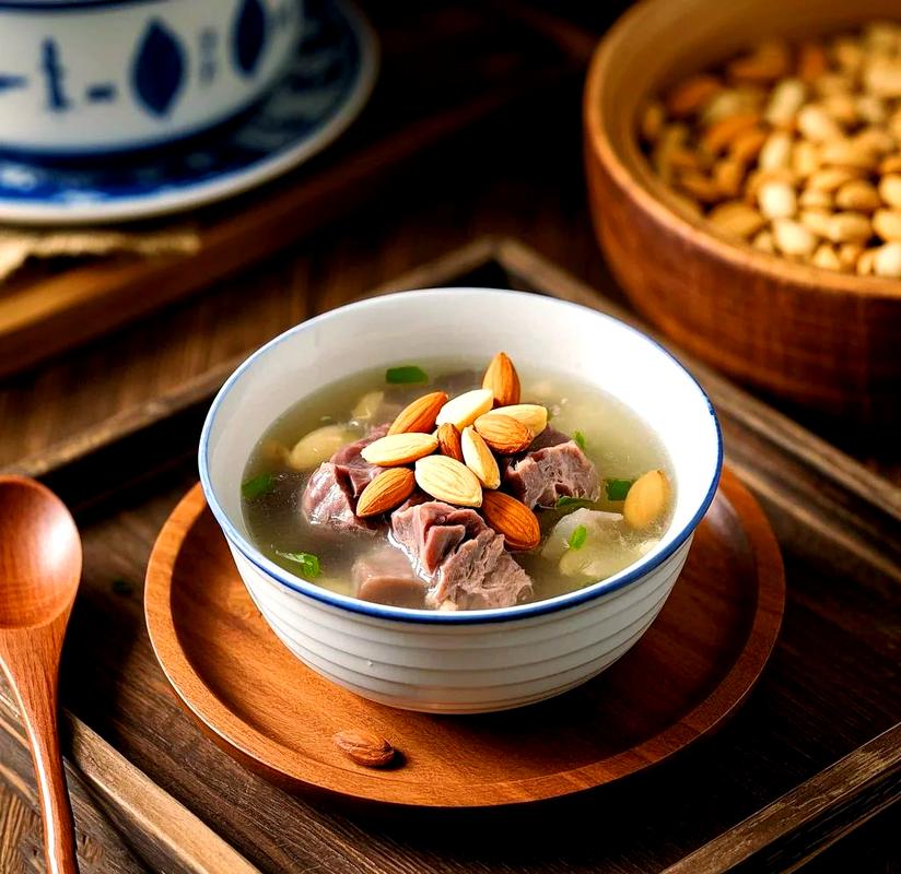 - 杏仁:润肺止咳、润肠通便,注意:这里指的是甜杏仁(南杏),有微毒的苦杏仁(北杏)需遵医嘱使用,南杏可以用来煲汤。