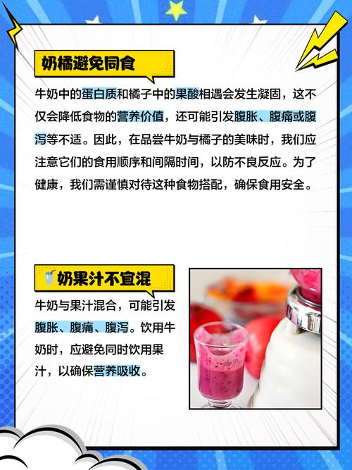 - 真相: 如前所述,橘子中的果酸(主要是柠檬酸)确实会使牛奶中的酪蛋白变性,但这个变性过程和胃酸的作用原理类似,并不会产生有毒物质,对于健康人来说,少量同食可能没有感觉,肠胃敏感的人可能会有些许不适,但远未到“中毒”的程度,只要不是一次性吃掉一个橘子再喝下一大杯牛奶,完全不必担心。