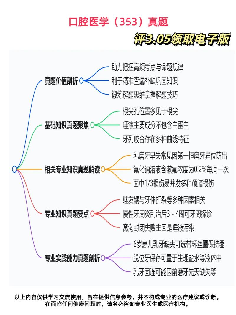 - 理解记忆,切忌死记:口腔医学的知识点很多,但很多都有其内在逻辑和联系,理解了“牙髓的防御机制”,就能更好地理解牙本质龋、盖髓术、根管治疗等一系列知识点。