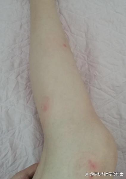- 特点:为红色风团样丘疹,中央常有水疱或叮咬痕迹,常成群出现,好发于腰、臀、四肢等暴露部位。