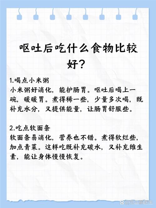 - 饮食调整: 呕吐后先喝清汤,再吃白粥、烂面条等易消化食物。