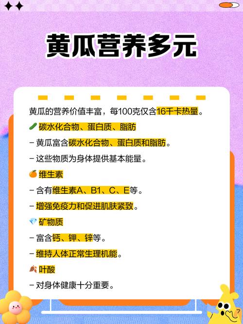 - 富含水分和营养:黄瓜含水量高达95%以上,是补充水分的佳品,它富含维生素C、维生素K、钾元素和膳食纤维,热量极低,非常适合减肥和日常保健。