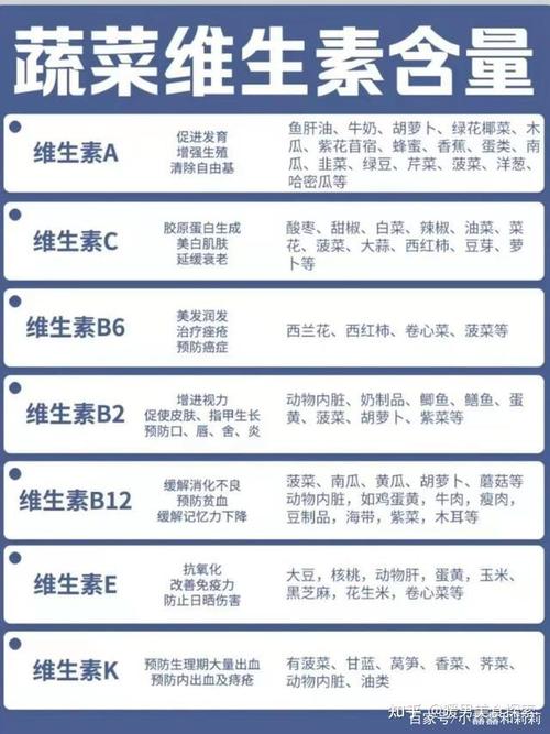 - 菠菜、西兰花、芦笋、芥菜等绿叶蔬菜中也含有维生素B2,但含量相对较低。