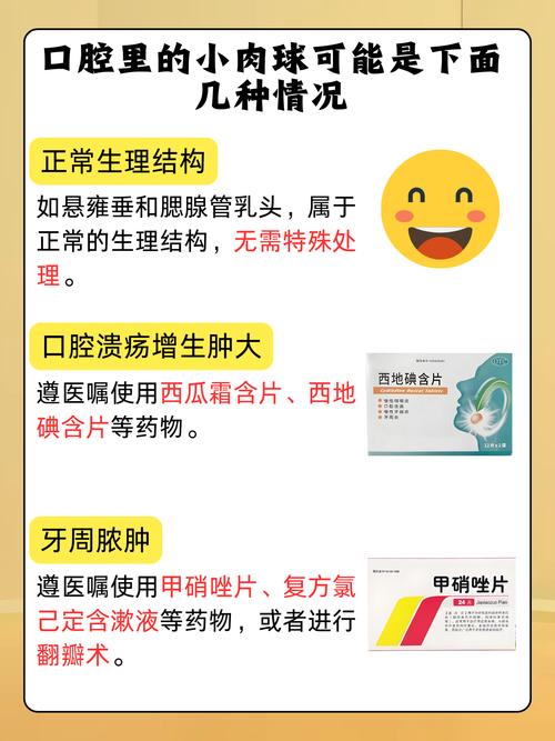 - 触感: 表面可能光滑,也可能有些粗糙,用手指触摸或舌头舔舐时,能感觉到它突出来。