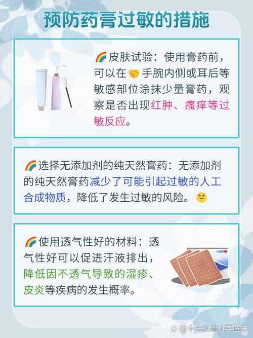 - 保持皮肤干燥: 贴药膏前确保皮肤清洁干燥,贴药后避免大量出汗,潮湿环境容易诱发刺激或过敏。