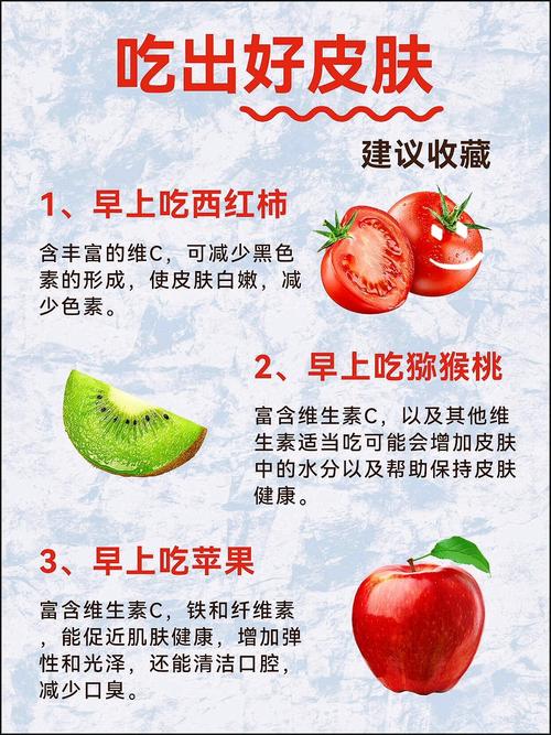 - 苹果:富含果胶和多种抗氧化物,有“一天一苹果,医生远离我”的说法,对皮肤健康有益。