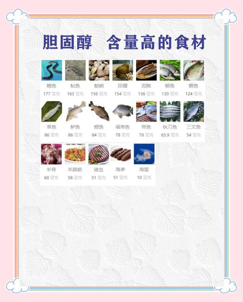 - 贝类:如扇贝、蛤蜊、生蚝等,胆固醇含量也相对较高。
