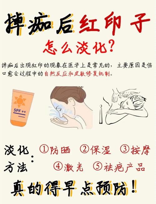 - 瘢痕形成:掉痂后不仅发红,还出现了凸起(增生性瘢痕)或凹陷(萎缩性瘢痕)。