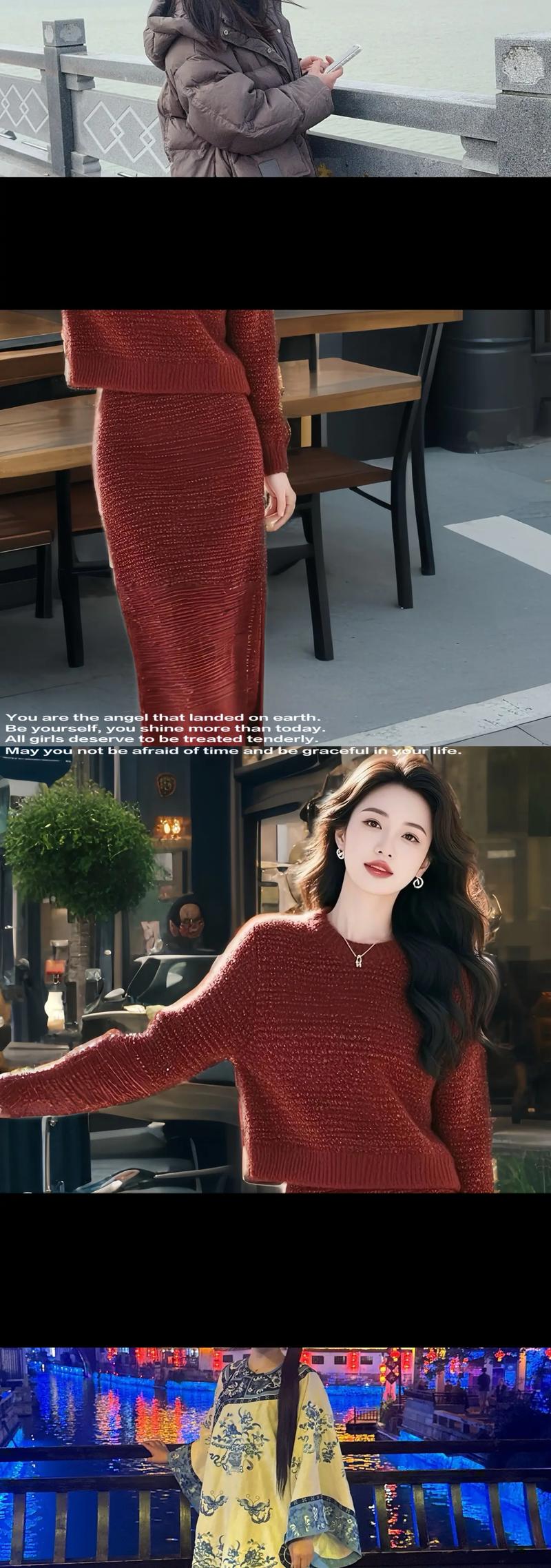 - 约会聚会: 暗红色丝绒吊带裙 + 外搭浅色针织开衫 + 金色细项链 + 裸色高跟鞋