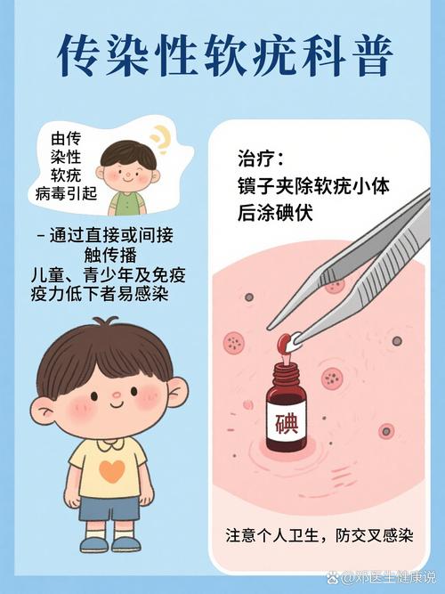 - 医生提醒: 传染性软疣具有传染性,不建议患者自行挤压或抠抓,以免病毒扩散到周围皮肤,导致皮损增多,治疗通常由医生进行,如刮除、冷冻等。