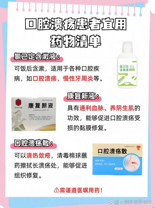 - 口腔溃疡: 抑制溃疡面周围细菌,防止继发感染,促进愈合。