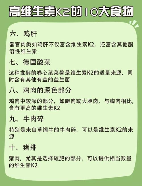 - 肉类:鸡肉、牛肉等也含有少量的K2(MK-4型)。