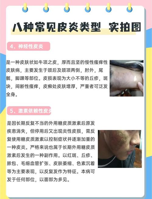 - 慢性、反复:皮肤问题持续很久时好时坏,皮肤可能变得粗糙、增厚、颜色变深,更符合慢性皮炎的特征。
