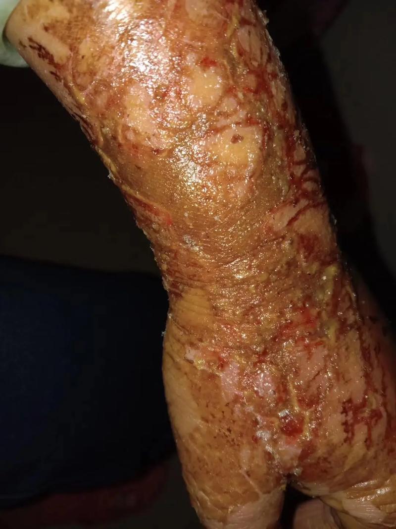 - 水疱形成:随着化学损伤的加深,真皮层受损,可能会形成水疱,水疱的液体可能呈淡黄色或淡红色,疱皮下的皮肤颜色会异常深。