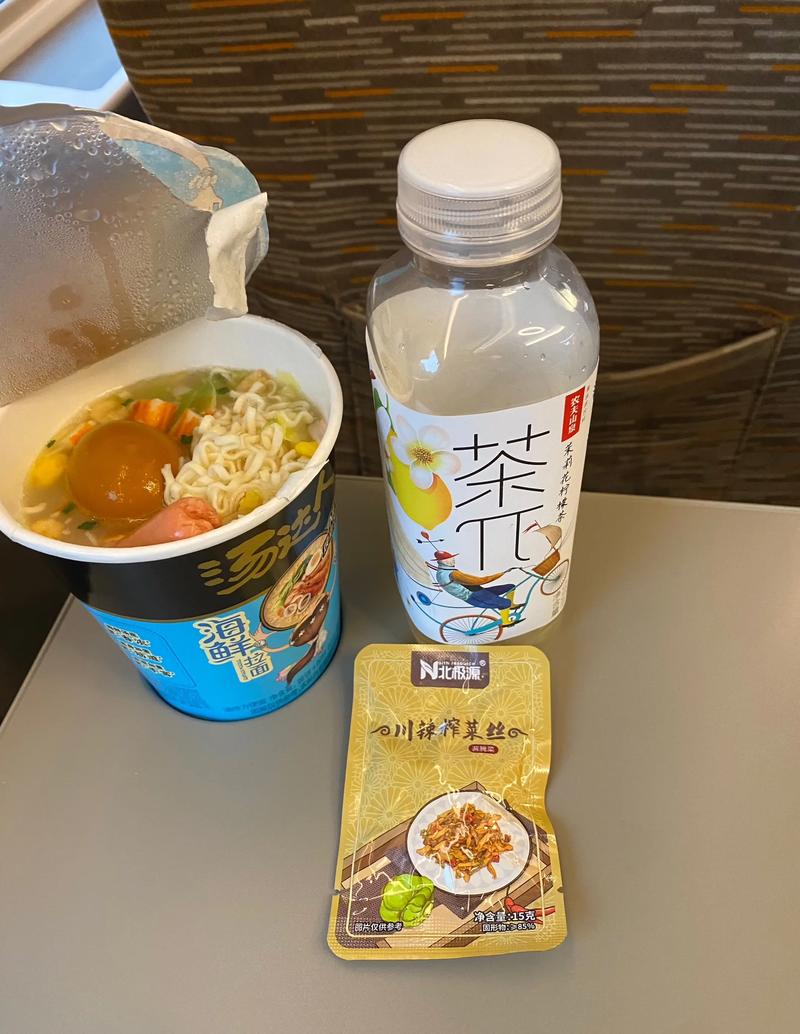 - 桶装泡面/拉面:高铁上的免费热水是泡面的福音,吃完后,把盖子盖好,用纸巾擦干净碗壁,再扔进垃圾桶,会显得很有礼貌。