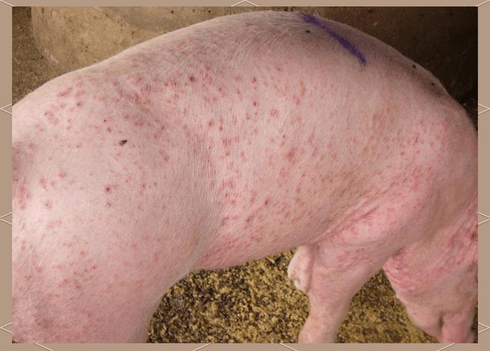 - “丘疹性皮炎”: 在猪的耳部、面部、躯干和四肢内侧出现圆形或不规则的、界限清晰的暗红色或紫色丘疹(像小疙瘩),中央可能有黑色结痂。