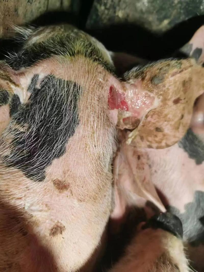 - 背部皮肤红肿、起泡: 在夏季强烈日晒下,无毛或少毛的猪背部皮肤会出现大面积的红肿、水疱,随后形成结痂,严重时会导致皮肤坏死和脱落。