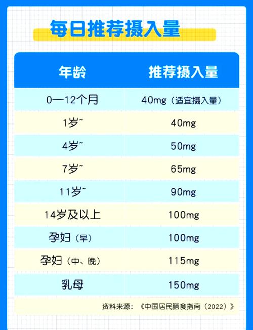 - 每日推荐摄入量:根据《中国居民膳食营养素参考摄入量》,普通成年人建议每日摄入100毫克维C。